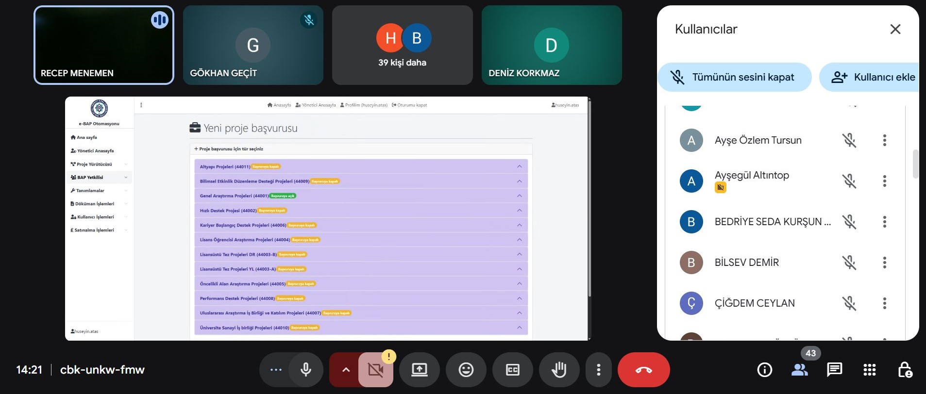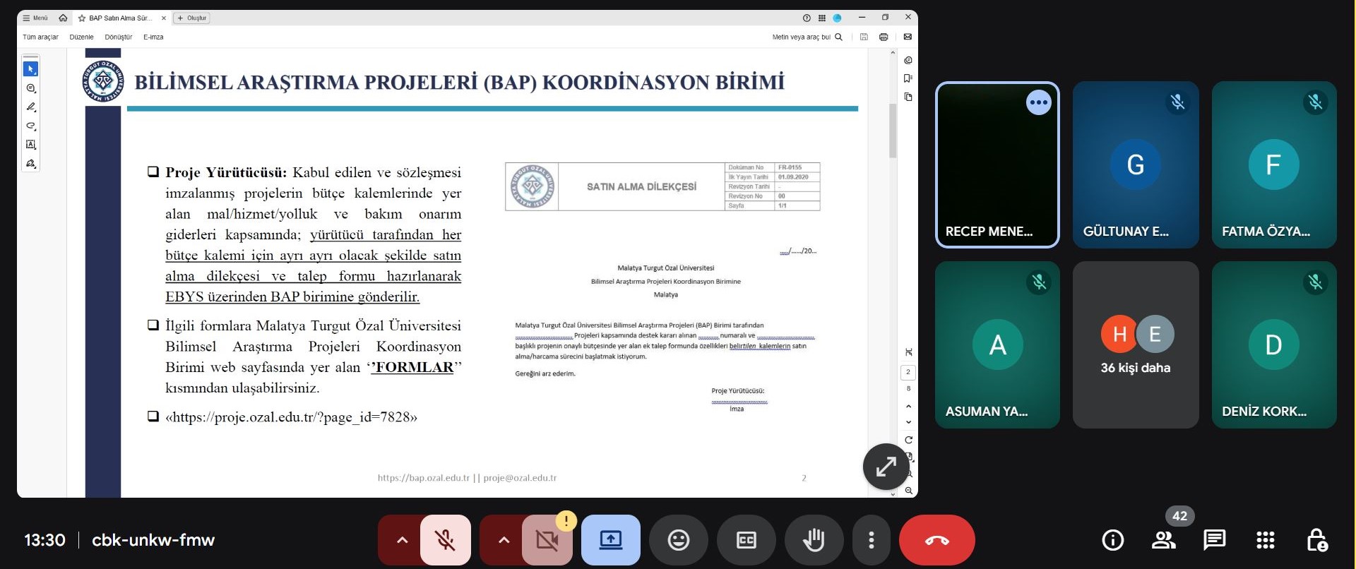 Malatya Turgut Özal Üniversitesi Bilimsel Araştırma Projeleri (BAP) Koordinasyon Birimi tarafından BAP, Türkiye Bilimsel ve Teknolojik Araştırma Kurumu (TÜBİTAK), Türkiye Sağlık Enstitüleri Başkanlığı (TÜSEB) ve diğer dış kaynaklı kurum ve kuruluşlar tarafından desteklenen araştırma projelerinde harcama ve ödeme süreçlerinin etkin şekilde yönetilmesine yönelik “Araştırma Projelerinde Harcama Süreçleri Bilgilendirme Eğitimi” düzenlendi. 19 Kasım 2025 tarihinde çevrim içi olarak düzenlenen etkinliğe yürütücü, araştırmacı ve danışman olarak projelerde görev yapan 50’nin üzerinde akademik personel katılım sağladı. Etkinlikte proje harcamalarının planlanması, satın alma süreçleri, bütçe yönetimi, ödeme prosedürleri, mevzuata uygunluk, raporlama adımları ve BAP projeleri kapsamında e-BAP Otomasyonu hakkında kapsamlı bilgiler sunuldu. Program, sunumların ardından katılımcılardan gelen soruların yanıtlandığı, katkı ve önerilerin değerlendirildiği bölümle tamamlandı.